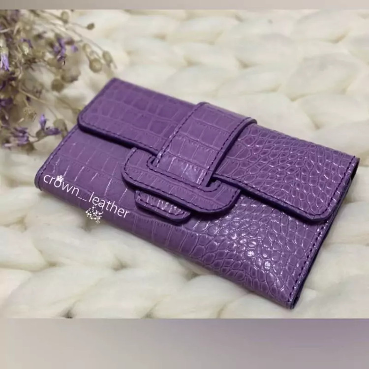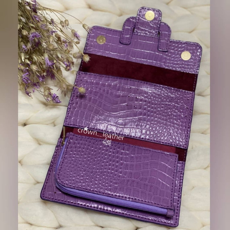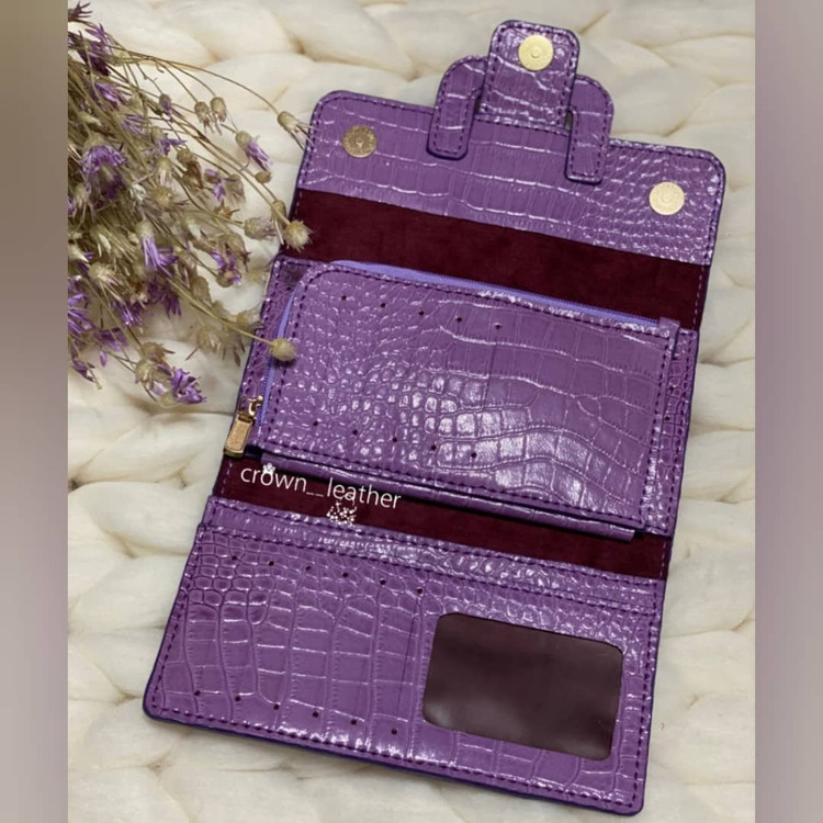 چرم طبیعی بزی ورنی کاملا دست دوز دارای 16جاکارت 1جاعکس3جا پول 1جای گوشی یا سکه ابعاد (12*21/5) رنگ یاسی