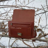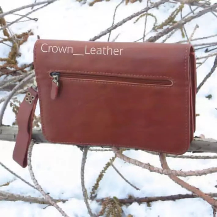 کاملا دستدوز چرم طبیعی گاوی دارای قفل دورمز داری یک زیپ در پشت و یک زیپ در جلوی کیف دارای یک جیب در جلوی کیف دارای 4جاکارتو یک جای عکس داخل کیف (در رنگ های عسلی ،قهوه ای ،مشکی قابل سفارش )